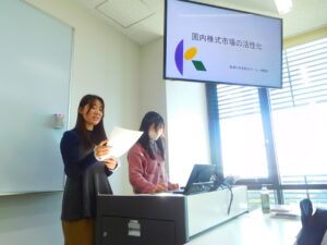 11月14日の授業では、前週に引き続き、証券ゼミナール大会に向けたプレゼン発表を行いました。 プレゼンの発表では、前週より改善させたスライドを作成できてはいましたが、完成度を高めるためにはまだまだ改善が必要でした。プレゼ